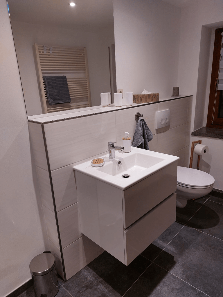 Im Bad befindet sich eine ebenerdige XXL Dusche, eine Toilette und ein Waschbecken mit großem Spiegel. Hand und Badetücher liegen für Sie bereit.