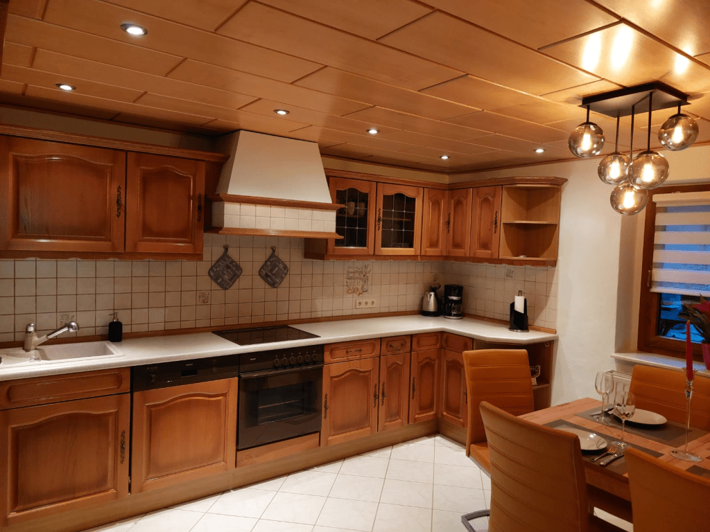 Die Küche ist mit allen üblichen Küchenutensilien ausgestattet und enthält weiterhin eine Kaffeemaschine und eine Mikrowelle. In der Küche befindet sich außerdem ein Esstisch mit fünf Stühlen.