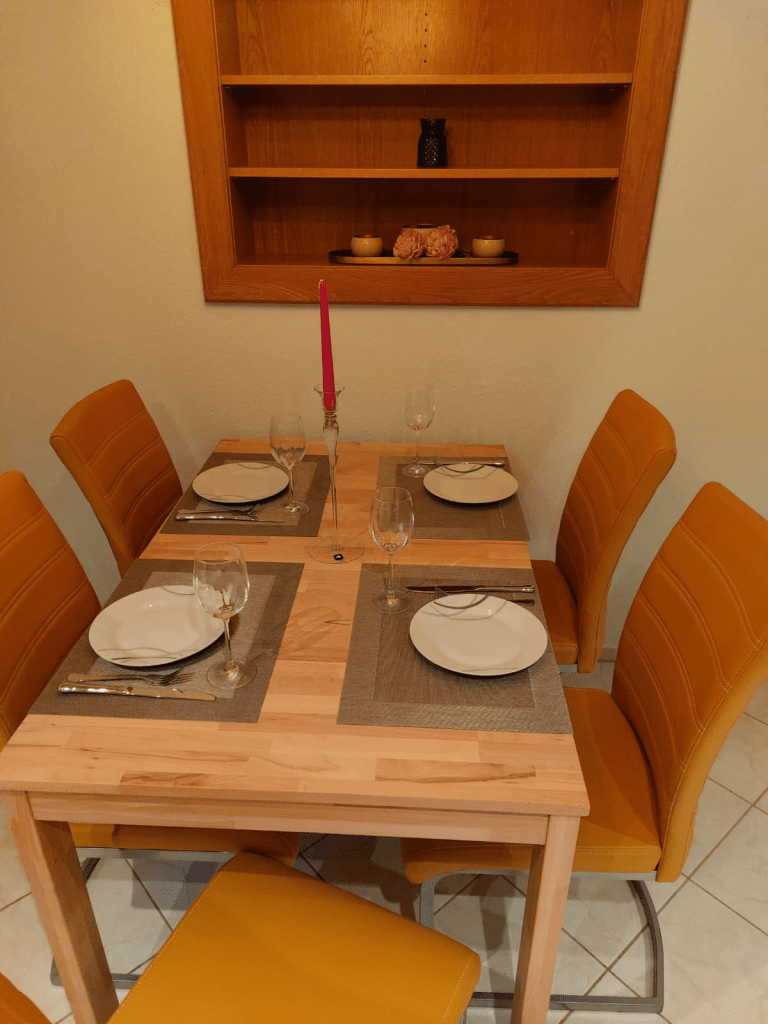 Im direkt angeschlossenen Esszimmer, befindet sich ein großer runder Esstisch mit vier Sitzplätzen.