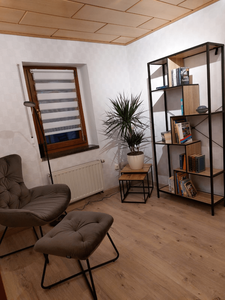 In der Leseecke befindet sich ein Sessel mit Hocker und ein gefülltes Bücherregal.